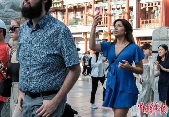 奥古斯塔·莱因哈特与中青报·中青网记者赵安琪相谈甚欢。她们聊起了在美国大学学习的趣事,认识异国朋友的“文化冲击”、美食……不时发出会心的笑声。“只有亲身来到中国,才能品尝到这里的美食,非常酷,味道超乎想象。”莱因哈特说要向那些“安利”她来中国看看的朋友好好“显摆”一下此行的收获。以往,她只能从图片中看中国,此次身临其境地走在前门大街上,花样繁多的“中华老字号”美食、神奇的北京中轴线、精妙的特色建筑,都令她赞不绝口,不时驻足打卡拍照,“竟然还有绿茶味道的冰激凌,我要尝尝。”