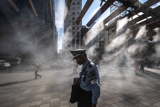 当地时间7月10日,日本东京,一名保安走过头顶的水雾系统。视觉中国供图
