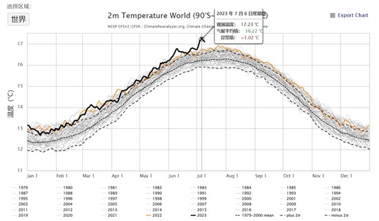 美国缅因大学气候研究所制作的网站Climate Reanalyzer展示着1979年以来历年的地球平均气温数据,2023年7月6日的数据是历年来的峰值。网页截图