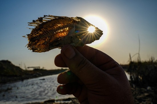 当地时间7月5日,伊拉克南部济卡尔省的奇巴伊什,一名男子在干涸的沼泽里展示一条鱼的骨架。视觉中国供图