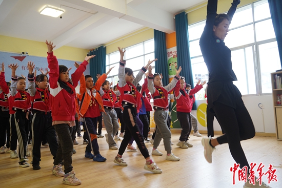 在一个下雨的早上,我旁听了一节上海真爱梦想公益基金会在边境小学开设的运动梦想课,因为天气限制,体育课挪到梦想中心教室进行。老师把教室里的桌椅都搬走,腾出空间,带领30多个学生在室内跟着儿歌跳操。