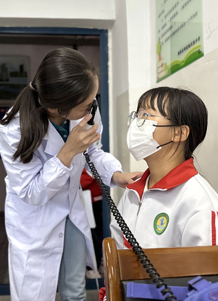 7月7日,北京协和医院医生在青海省海北藏族自治州海晏县寄宿制民族中学为学生做视力检查。近日,来自北京协和医院、中央和国家机关青年联合会的近20名专家来到该校,为孩子们进行骨科、眼科、儿科综合检查。新华社记者 张子琪/摄