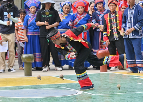 7月11日,在大化瑶族自治县仁良村,村民在陀螺文化展演活动中打陀螺。当日,广西大化瑶族自治县的各族群众欢聚一堂,通过打陀螺、跳民族舞蹈、射弩等丰富多彩的民间文娱活动,欢庆一年一度的传统节日——“祝著节”。新华社记者 黄孝邦/摄