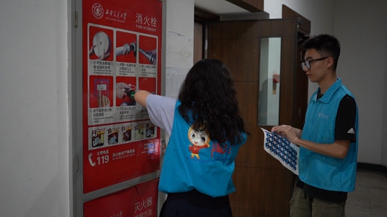 西安交通大学兴庆校区星航志愿者巡楼排查消防安全隐患。西安交通大学供图