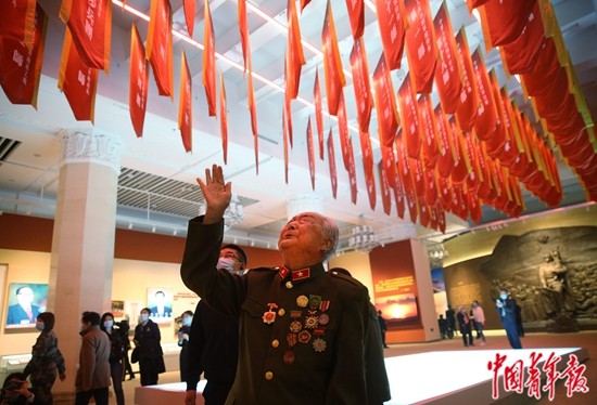 2020年10月20日,纪念中国人民志愿军抗美援朝出国作战70周年主题展览现场,志愿军老兵朱述元在印着中国人民志愿军部队番号的旗帜下看到了自己当年所在部队的旗帜时热泪盈眶,激动地呼唤着牺牲战友的名字。中青报·中青网记者 陈剑/摄