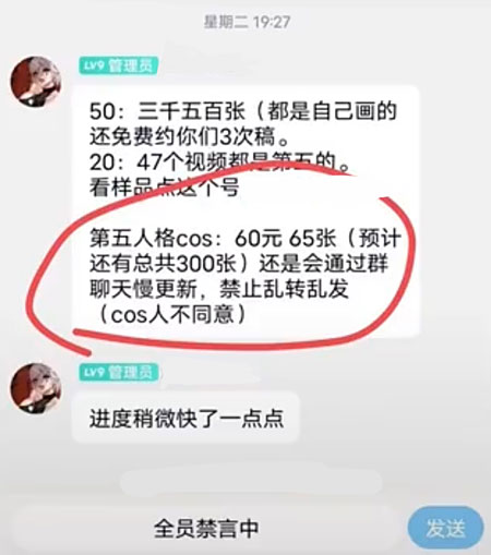 李亦从洛粉组建的一个群聊中发现了端倪。在这里,洛粉不仅继续提供“改图”的服务,更发布了大量带有暗示挑逗意味的图片,以图集形式公开叫卖,称60元可以买到65张,“预计还有总共300张会通过群聊慢慢更新”。