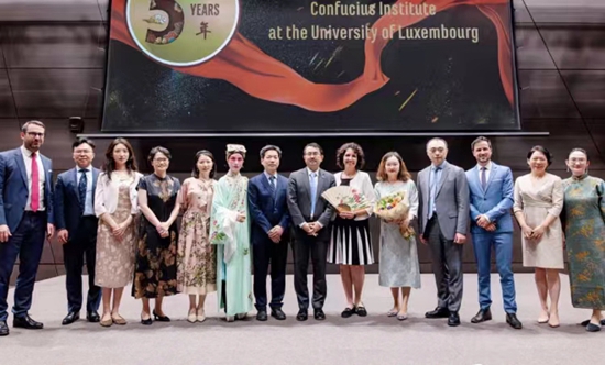当地时间6月20日晚,北京大学代表团应邀出席卢森堡大学孔子学院建院五周年庆典活动,为中外嘉宾带去北大昆曲古琴专场演出。演出结束后,北大代表团与中国驻卢森堡大使华宁(右七)合影,右八为本文作者陈均副教授。北京大学昆曲传承与研究中心供图