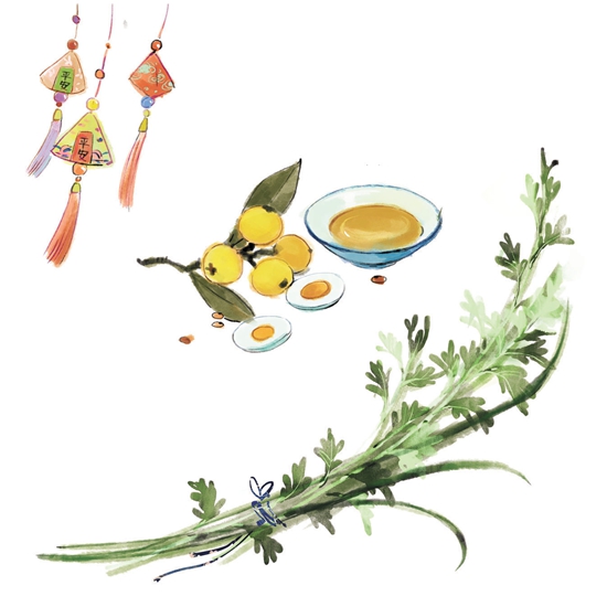 “天中五瑞”也是带“五”节俗之一,这里须强调“天中”二字。古时称“五瑞”的非只一种。璧、璜、圭、琮、璋五种玉器是“五瑞”。汉代又以黄龙、白鹿、甘露、嘉禾、木连理为“五瑞”。天中节是端午别称之一,“天中五瑞”特指端午节的五种瑞物。宋人孟元老《东京梦华录》写北宋汴梁城“自五月一日及端午前一日,卖桃、柳、葵花、蒲叶、佛道艾,次日家家铺陈于门首”,说的是端午有悬挂、装点花草的习俗。“天中五瑞”就是这许多陈设中的几种。明朝张岱《夜航船》中说,端阳日以石榴、葵花、菖蒲、艾叶、黄栀花插瓶中,谓之“五瑞”,避除不祥。现在,“天中五瑞”通说为:菖蒲、艾草、石榴花、龙船花和蒜头。