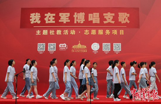 7月18日,北京中国人民革命军事博物馆,来自山东威海市少儿合唱团的小团员参加完“我在军博唱支歌”活动后,走下舞台。暑期来临,很多家长带孩子到军博参观。中青报·中青网记者 陈剑/摄