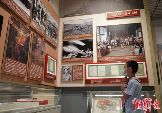 7月18日,北京中国人民革命军事博物馆,人民军队庆祝中国共产党成立100周年主题展览,一个小朋友在“抗美援朝 保家卫国”展区驻足观看。展览墙上挂着中国人民志愿军著名战斗英雄黄继光(左一)、邱少云(左二)等的画像和事迹。中青报·中青网记者 陈剑/摄