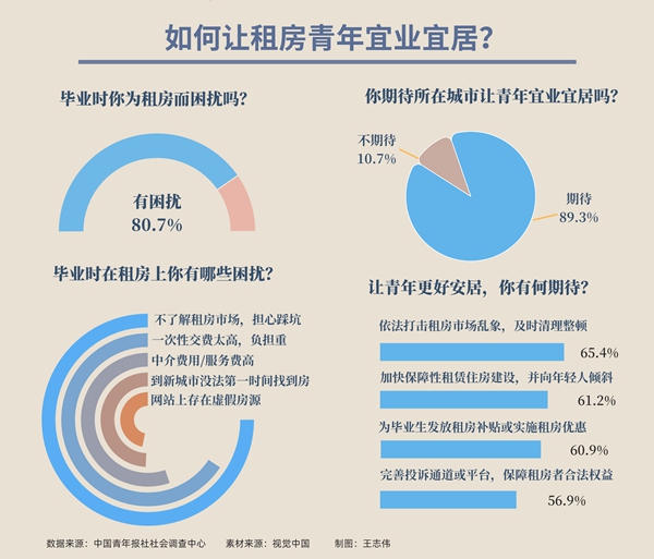 本周,中国青年报社社会调查中心联合问卷网(wenjuan.com)发布的一项有1001名受访者参与的调查显示,80.7%的受访者毕业时为租房而困扰,不了解租房市场,担心踩坑是受访者最困扰的问题。让年轻人住有所居、住有宜居,65.4%的受访者认为应依法打击租房市场乱象,61.2%的受访者期待加快保障性租赁住房建设,并向年轻人倾斜。