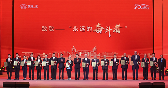 从蹒跚学步到奋起直追,从引进学习到引领全球产业发展,每一代中国汽车人都不曾忘记自己的使命。在大会上,中国一汽为奋斗者代表颁发了致敬信和纪念章。