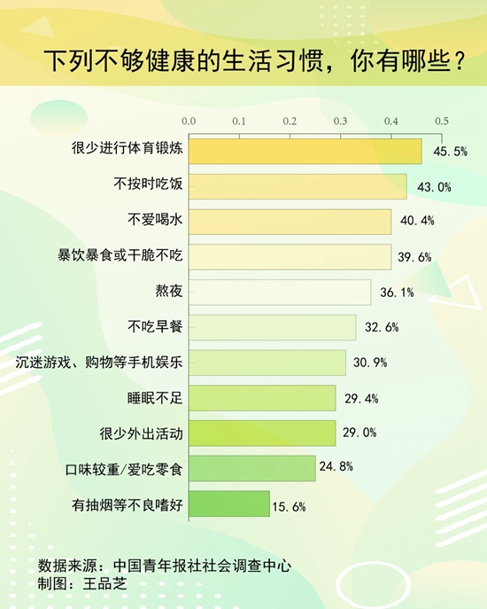 调查显示,排在前三位的青年不健康生活习惯是:很少进行体育锻炼(45.5%)、不按时吃饭(43.0%)、不爱喝水(40.4%),其他还有:暴饮暴食或干脆不吃(39.6%)、熬夜(36.1%)、不吃早餐(32.6%)、沉迷游戏购物等手机娱乐(30.9%)、睡眠不足(29.4%)、很少外出活动(29.0%)、口味较重/爱吃零食(24.8%)、有抽烟等不良嗜好(15.6%),仅4.1%的受访青年表示都没有。