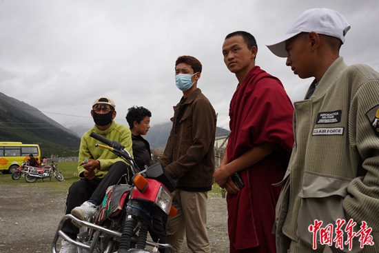 7月11日,西藏昌都八宿县然乌镇阿日村,几位在义诊活动上为北京医疗专家做翻译的年轻人聚集在村口。他们大多从县里的初中毕业后留在村里,帮家里放牧、挖虫草。19岁的扎西巴邓(左三)是村里为数不多的大学生,目前在福建三明学院学习建筑工程专业。会汉语、受过教育的年轻一代村民搭起了村庄与外面世界的桥梁。