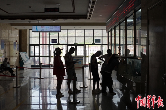 7月10日,西藏昌都八宿县人民医院,大厅内排队挂号缴费的患者。