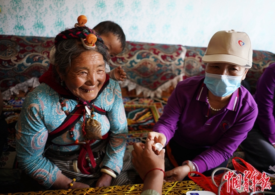 7月9日下午,西藏自治区昌都市八宿县西巴易地扶贫搬迁安置点,来自北京的医务志愿者来到行动不便的患者家中,为他们量血压、听心肺,进行入户问诊,提供治疗方案。