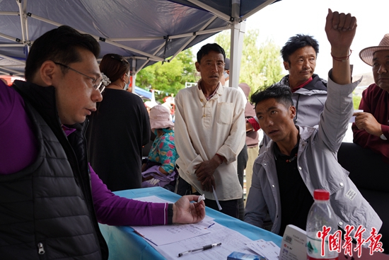 34岁的吉巴因长期背部疼痛前来求医。这种疼痛已持续了3年,但他认为这只是“一点点痛”,因此没去医院看过。北京市西城区陶然亭社区卫生服务中心中医全科医生许建在义诊现场为他针灸缓解疼痛。许建曾在青海玉树义诊,他观察到,由于传统观念、当地医疗资源匮乏等诸多原因,过去藏区群众生病,普遍缺乏就医意识。随着现代化和城市化进程的推进,这种情况在年轻一代中有所改善。