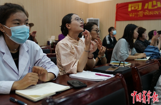 7月10日,西藏昌都八宿县人民医院,来自北京的医疗专家讲授小儿推拿和发热诊治的相关知识,一名当地县医院的年轻医护人员正在学习推拿手法。