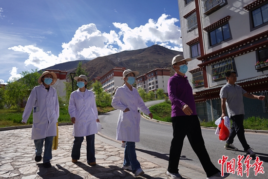 7月9日,西藏自治区昌都市八宿县西巴易地扶贫搬迁安置点,28岁的藏医央金(左一)带着来自北京的医务志愿者们去往行动不便的居民家中问诊、慰问。