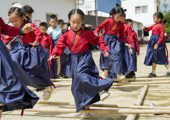 7月22日,重庆市万州区恒合土家族乡一个研学基地内,参加暑期避暑研学活动的学生在练习传统体育运动跳竹竿。新华社记者 刘潺/摄