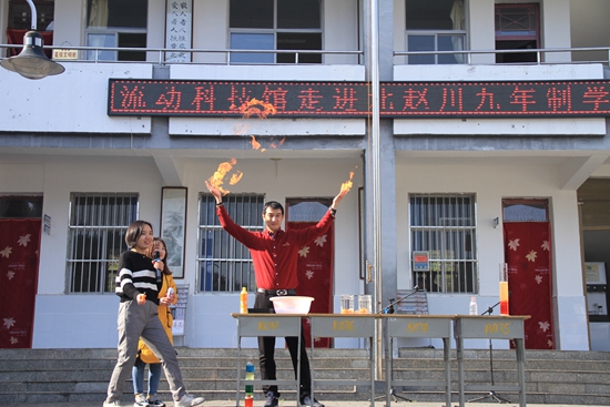 付佳乐与指导教师一起为丹凤县武关镇北赵川九年制学校展示趣味科学实验。受访者供图