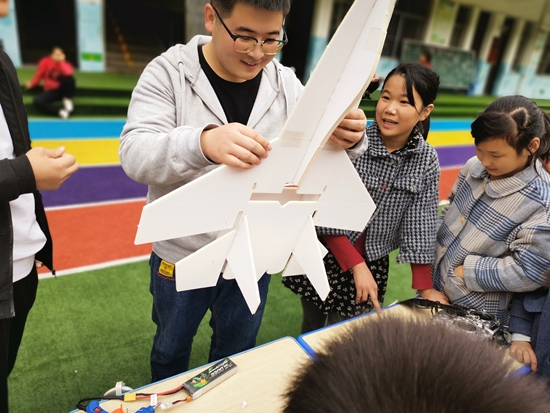 志愿者与孩子们一起制作航模飞机。受访者供图