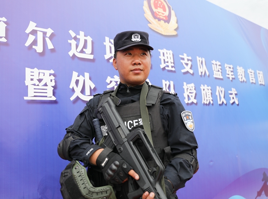 2021年6月28日,巴彦淖尔边境管理支队举行蓝军教官团暨应急处突分队授旗仪式,杨宁作为应急处突队员参加仪式。受访者供图