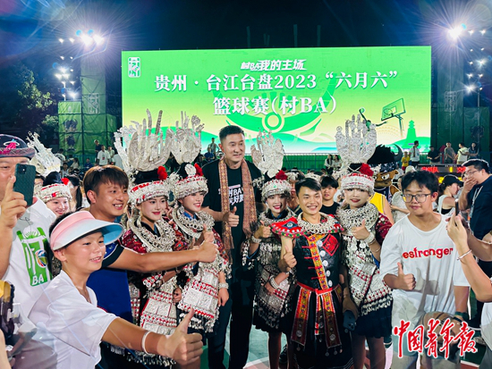 7月23日晚上,在上万人的“村BA”现场,篮球教练杜锋与年轻的球迷“蹦苗迪”,并为当晚赛事开球。当天,在贵州省台江县方召镇中心小学,“锋基金”和国强公益基金会合作捐建的“杜锋篮球场”揭牌,助力乡村小学篮球教育发展。中青报·中青网记者 林洁/摄