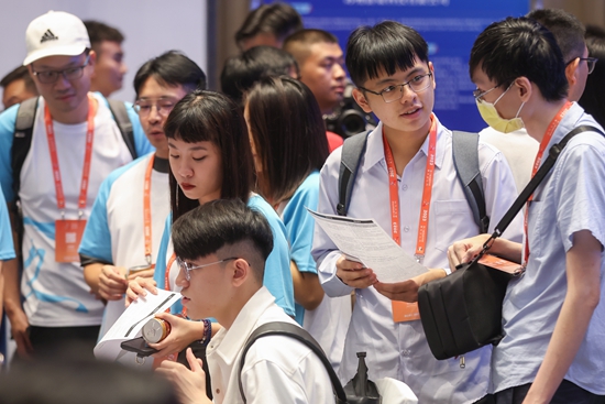 7月26日,苏州,台湾青年寻找就业岗位。作为第三届海峡两岸青年文化月活动的一部分,“百企千岗等你来”台湾青年专场招聘会在江苏苏州举行,百余家企业提供的千余个岗位吸引了数百名台湾青年前来找寻自己心仪的工作。中新社记者 泱波/摄