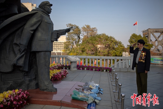 2020年10月17日,辽宁省丹东市鸭绿江断桥景点,抗美援朝参战老兵何衡昆向雕塑群像《为了和平》敬军礼致意。何衡昆当年曾参加上甘岭战役,一天前,他和家人从江苏省昆山市老家专程赶到这里。中青报·中青网记者 李隽辉/摄