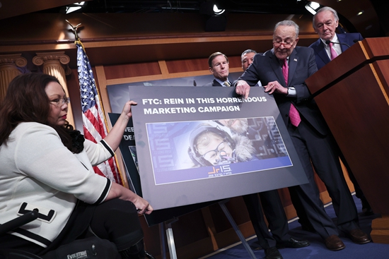 1月26日,美国华盛顿特区,美国参议院多数党领袖、民主党参议员查克·舒默(右二) 在美国国会大厦新闻发布会上与其他议员一起谴责武器公司向儿童销售“JR-15”步枪。视觉中国供图