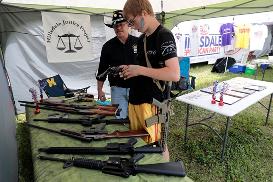7月19日,美国密歇根州,在艾奥尼亚市的一个农田中举行的“捍卫我们的第二修正案:密歇根州为自我保护而战”集会上,14岁的耶利米·温特(右)看着乔恩·保罗·鲁坦(左)向他展示的枪支。视觉中国供图
