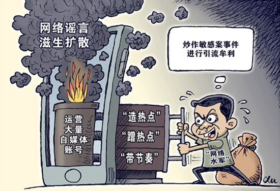 编造传播虚假信息“造热点”“蹭热点”“带节奏”,炒作敏感案事件进行引流牟利,开设假冒媒体网站和自媒体账号,打着“舆论监督”等旗号,实施敲诈勒索……这些行为被公安机关严厉打击。徐骏/作(新华社发)