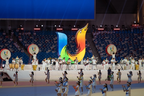 7月28日,成都第31届世界大学生夏季运动会开幕式上,青年大学生打击乐队现场演奏。汪龙华/摄