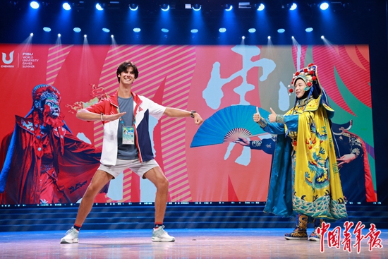 7月29日,四川成都,大运村内运动员联欢会上,一名美国留学生在川剧演员的指导下做川剧动作。中青报·中青网记者 曲俊燕/摄