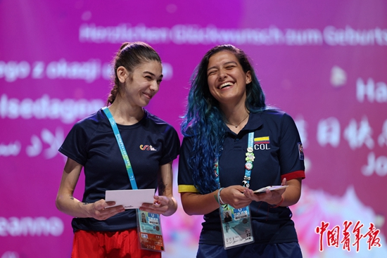 7月29日,四川成都,大运村内运动员联欢会上,来自西班牙和哥伦比亚的两名大学生运动员正好当天过生日,她们上台接受四川特色的礼物和全场观众的祝福。中青报·中青网记者 曲俊燕/摄