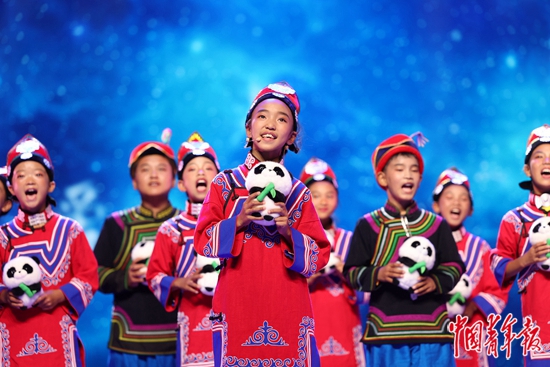 7月29日,四川成都,大运村内运动员联欢会上,四川凉山喜德县果果合唱团的小朋友们在表演。中青报·中青网记者 曲俊燕/摄