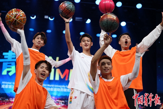 7月29日,四川成都,大运村内正在上演一场运动员联欢会,汶川地震中的“敬礼娃娃”郎铮(中)表演篮球节目,几天前他刚收到北京大学的录取通知书。中青报·中青网记者 曲俊燕/摄
