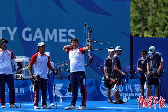 7月30日,四川成都中国现代五项赛事中心,成都大运会射箭比赛团体项目决赛中的中国选手。中青报·中青网记者 赵迪/摄
