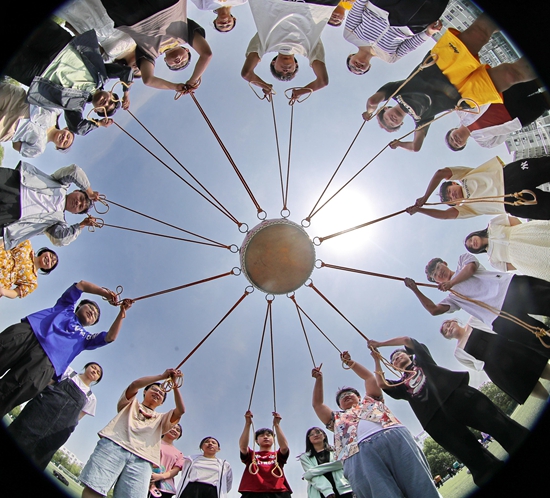 5月24日,河北秦皇岛,东北大学秦皇岛分校的大学生体验趣味游戏“鼓舞人心”。视觉中国供图