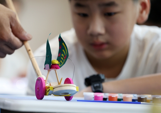 7月20日,山东省临沂市,郯城县郯城街道府东社区“沂蒙小学堂”,一名小男孩正在观看木旋玩具。图片由视觉中国提供