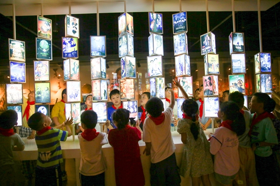 7月18日,江苏南通,如皋市华夏电影展示馆,小学生在参观创意电影海报墙。图片由视觉中国提供