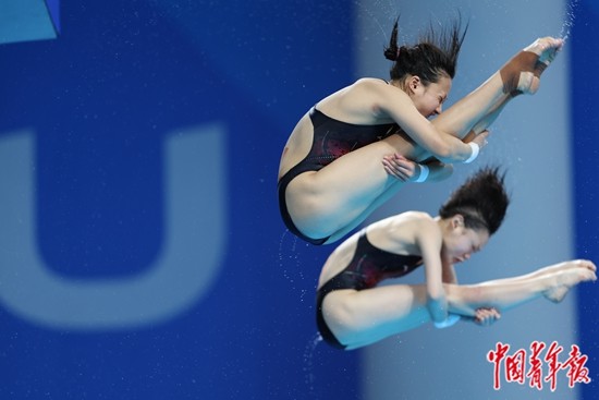 7月31日,四川成都,成都大运会跳水项目开始首个比赛日,女子双人10米跳台决赛中,掌敏洁和张家齐在比赛中。面对决赛仅有的一个对手韩国队,中国组合张家齐/掌敏洁毫无悬念夺冠,为中国队拿下成都大运会跳水项目的第二枚金牌。中青报·中青网记者 曲俊燕/摄