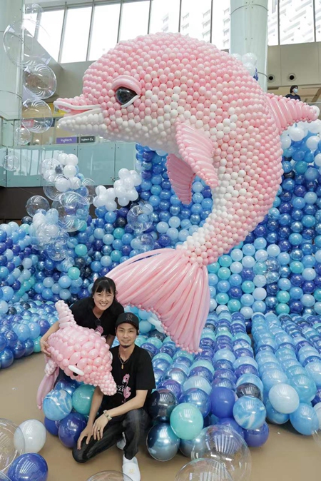 孙杰(右一)与自己制作的立体海豚气球造型合影。受访者供图