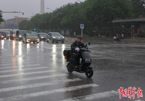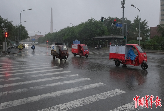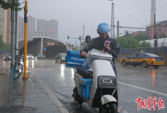 7月29日,北京市发布暴雨红色预警信号,全市范围普降大雨,快递骑手们冒雨送货。中青报·中青网见习记者 田嘉硕/摄