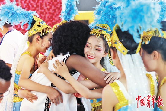 7月21日,青海格尔木,格尔木市青少年活动中心,就读于北京语言大学的苏里南共和国留学生安瑞琪和孩子们在演出后交流并拥抱。中青报·中青网见习记者 余冰玥/摄