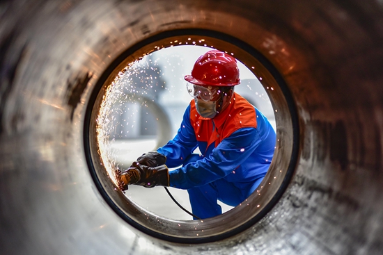 7月31日,山东青州,经济开发区一家设备制造企业车间内,工人进行打磨作业。视觉中国供图