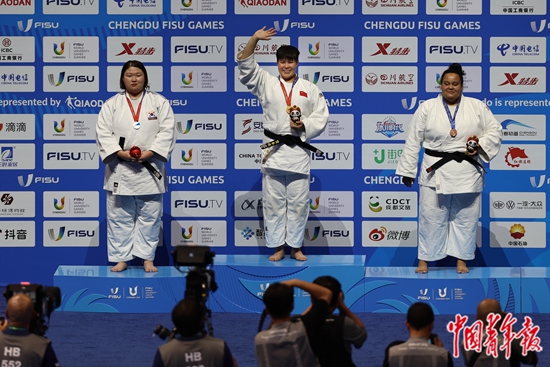 7月31日下午,四川省成都市,成都第31届世界大学生夏季运动会,柔道女子78公斤以上级决赛领奖台,中国选手贾春迪向观众挥手致意。当日,在该项比赛中,中国选手贾春迪战胜韩国选手夺得冠军,为中国柔道队拿到成都大运会首金。中青报·中青网记者 赵迪/摄