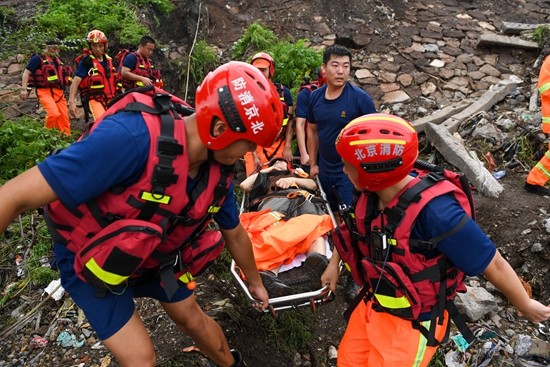 8月1日,在北京市门头沟区水峪嘴村,北京大兴区消防救援支队的消防员在转运一名受伤村民。受台风“杜苏芮”影响,北京自7月29日开始连续强降雨,西部、西南部、南部遭遇特大暴雨。位于北京市西部的门头沟区部分区域发生山洪灾害,记者在一线直击救援现场。新华社记者 鞠焕宗/摄