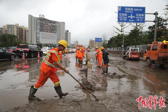 8月1日,北京门头沟街头,道路养护工人正在清理路面淤泥。为尽快恢复暴雨后的城市环境卫生面貌,北京市多个部门组织人员进行汛后清淤工作。中青报·中青网记者 陈剑/摄